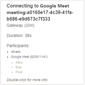 When viewing a Gateway call to an externally-hosted conference, such as a Microsoft Teams or Skype for Business meeting, or Google Meet, all of the externally-connected participants are listed (grayed out).