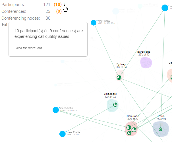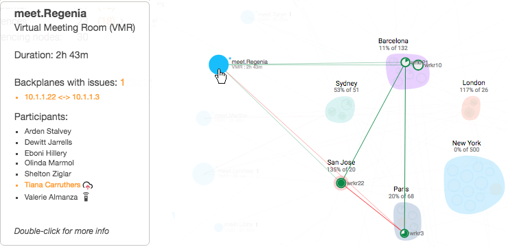 Hovering also highlights all the Conferencing Nodes that are handling media for that conference. Any backplane issues are highlighted — if a backplane link has poor quality, it is shown in red, and if a participant has poor quality, the link between their node and the conference is also shown in red.