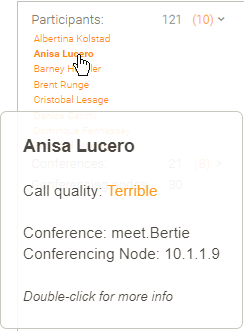 The issues statistics (in orange) are only shown if any of the participants or individual conferences are experiencing call quality issues. If you hover over this area, the affected participants and conferences are indicated: