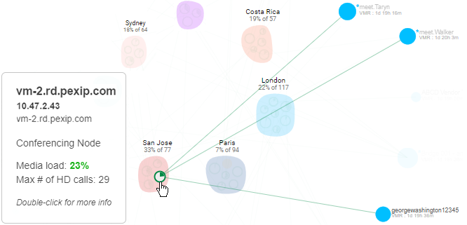 . Nodes in the same location are grouped together. Hovering over each node's icon provides information about that node's hostname, IP address, current load and estimated capacity (in terms of the estimated maximum number of calls the node can handle). Hovering also highlights all the conferences for which that node is handling the media.