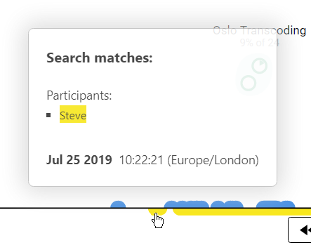When a filter is applied in live view, the timeline at the bottom of the page indicates in yellow all the times in the past when there was a conference or participant matching the filter. If you hover over these yellow indicators, information about the match will appear.