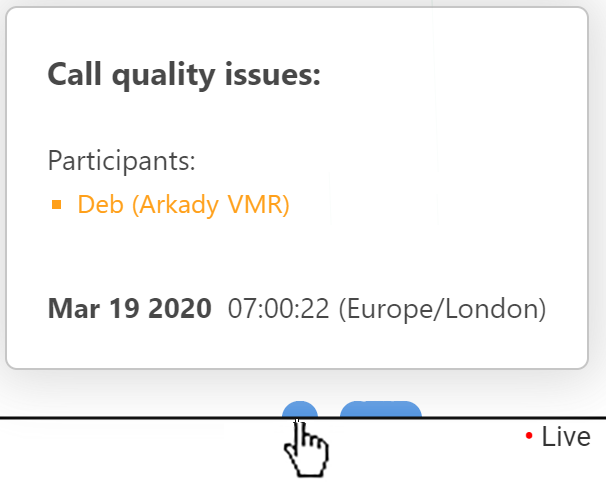 The interactive timeline indicates in blue any times in the past when a participant or backplane had call quality issues. You can hover over each blue bubble to get details of the issues that occurred at that time. In very large/busy systems with poor networks this is limited to the last 10,000 events over the last 7 days.