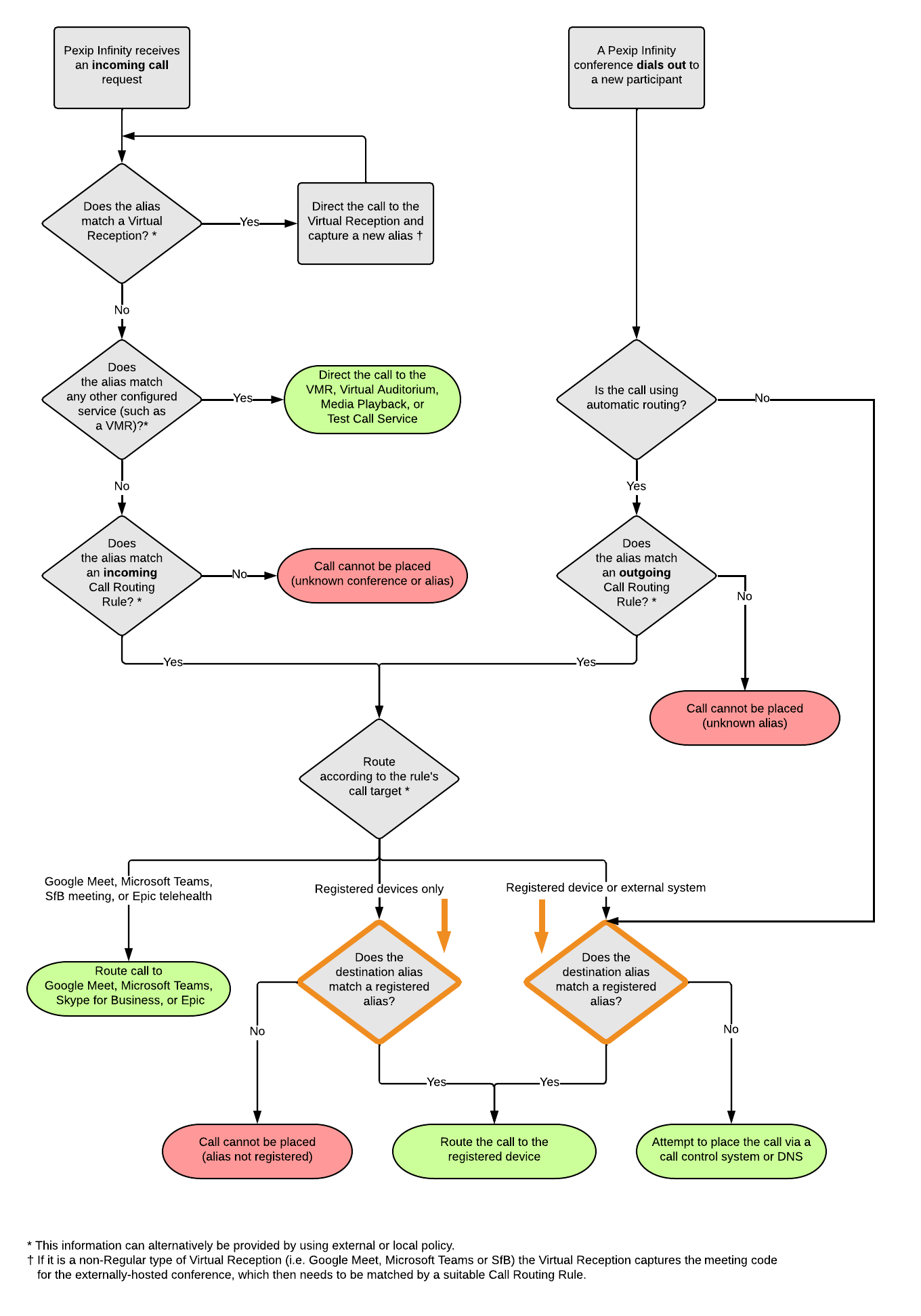 Whenever Pexip Infinity needs to place a call it follows the Call routing logic shown in the diagram below. If the alias it is trying to place the call to is currently registered, then Pexip Infinity will place the call to that registered device instead of attempting to find it via other means such as call control or DNS.
