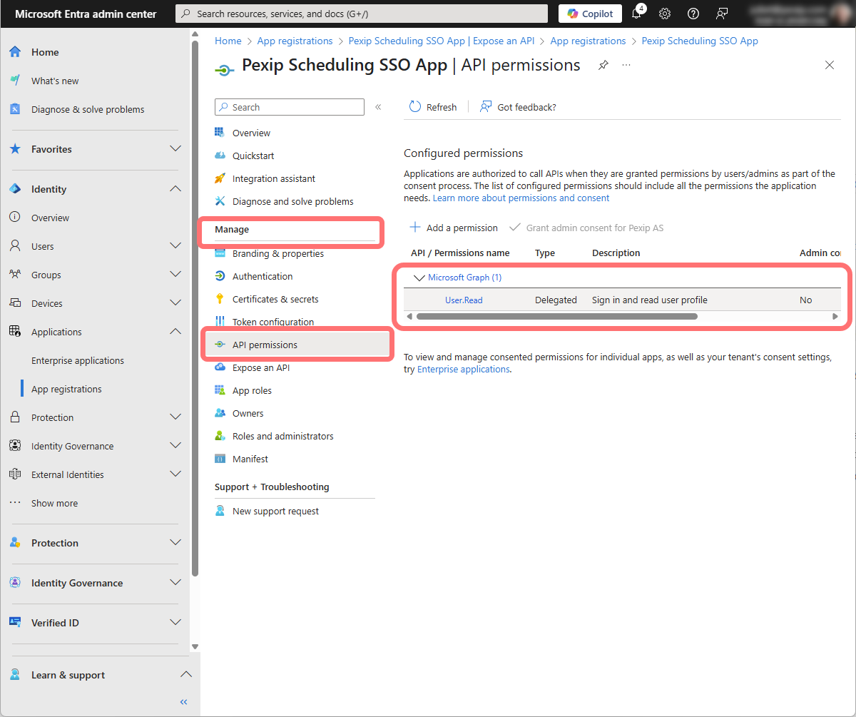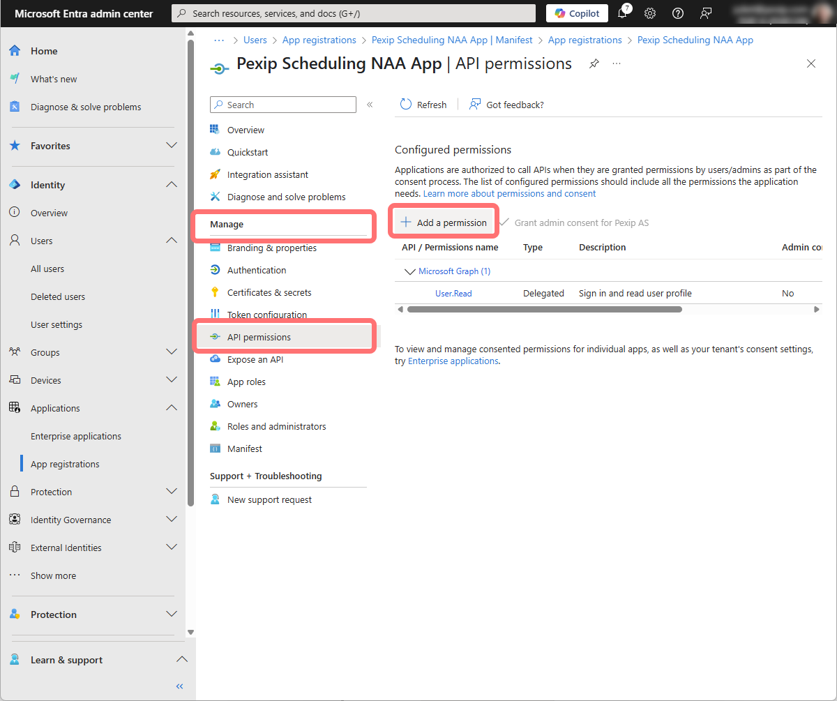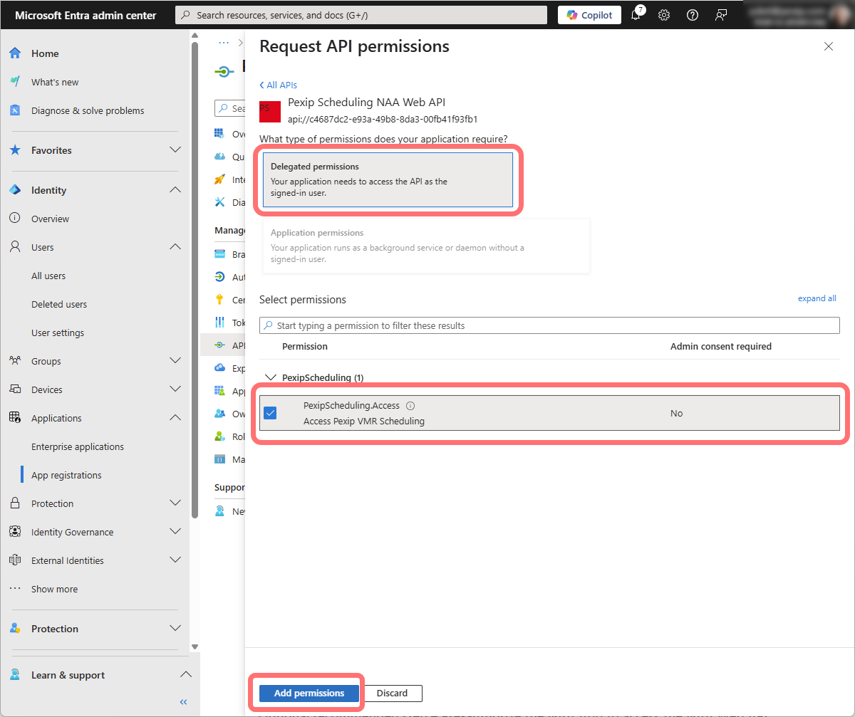 This step is optional, but we recommend you do this to make the sign in flow for your users easier. Without this step, by default when users first use the add-in, they will be presented with two pop-ups requesting consent — one for the Pexip Scheduling NAA App (which also refers to the Access Pexip VMR Scheduling custom scope we created in the previous step), and one for the Pexip Scheduling NAA Web API.