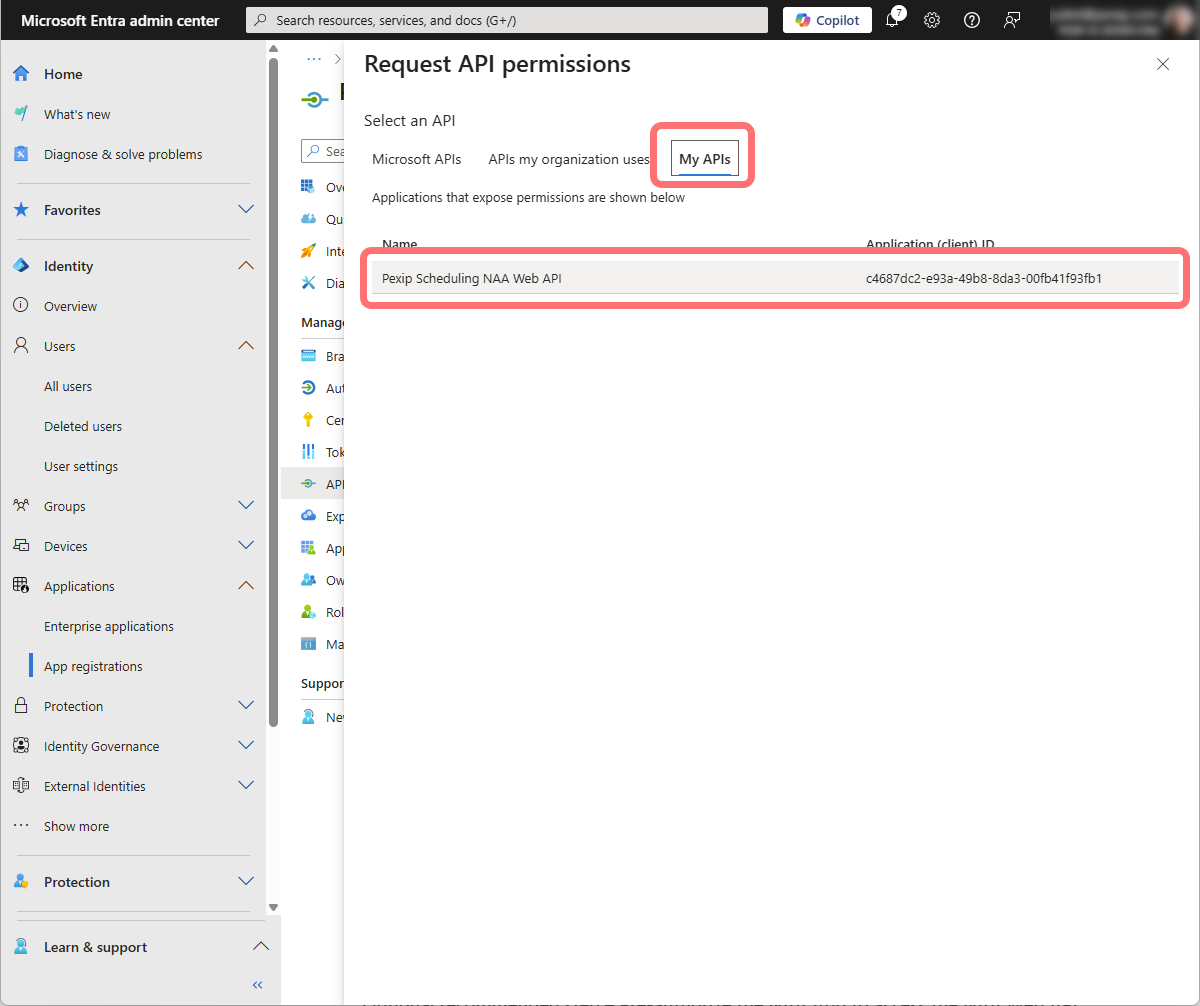 Select the My APIs tab. Find and select the Web API you created in the previous step (in our example, this is named Pexip Scheduling NAA Web API):