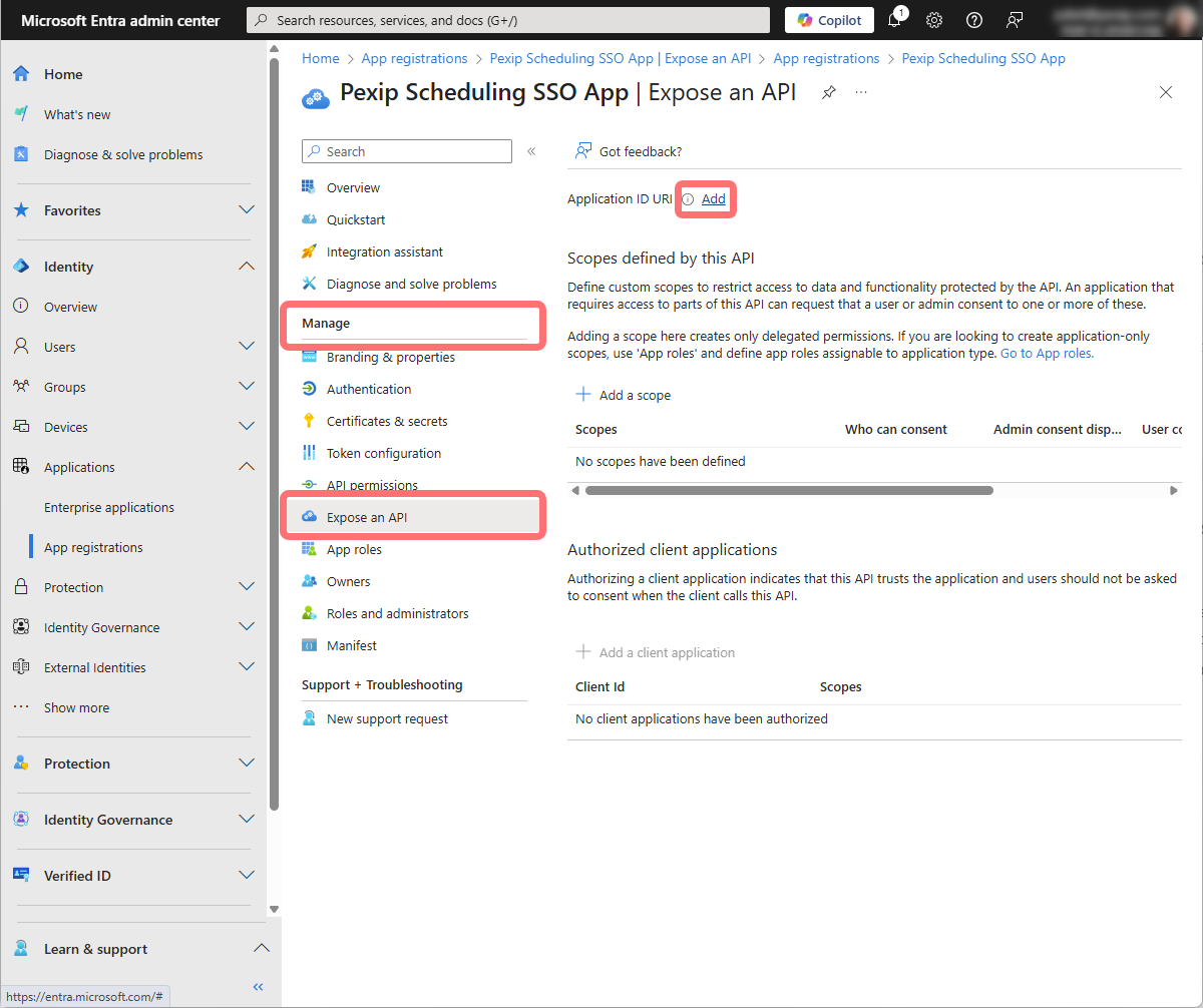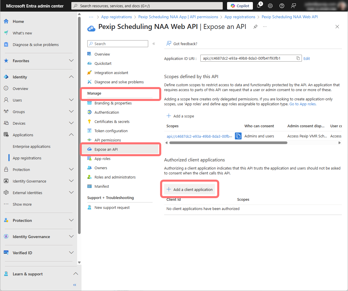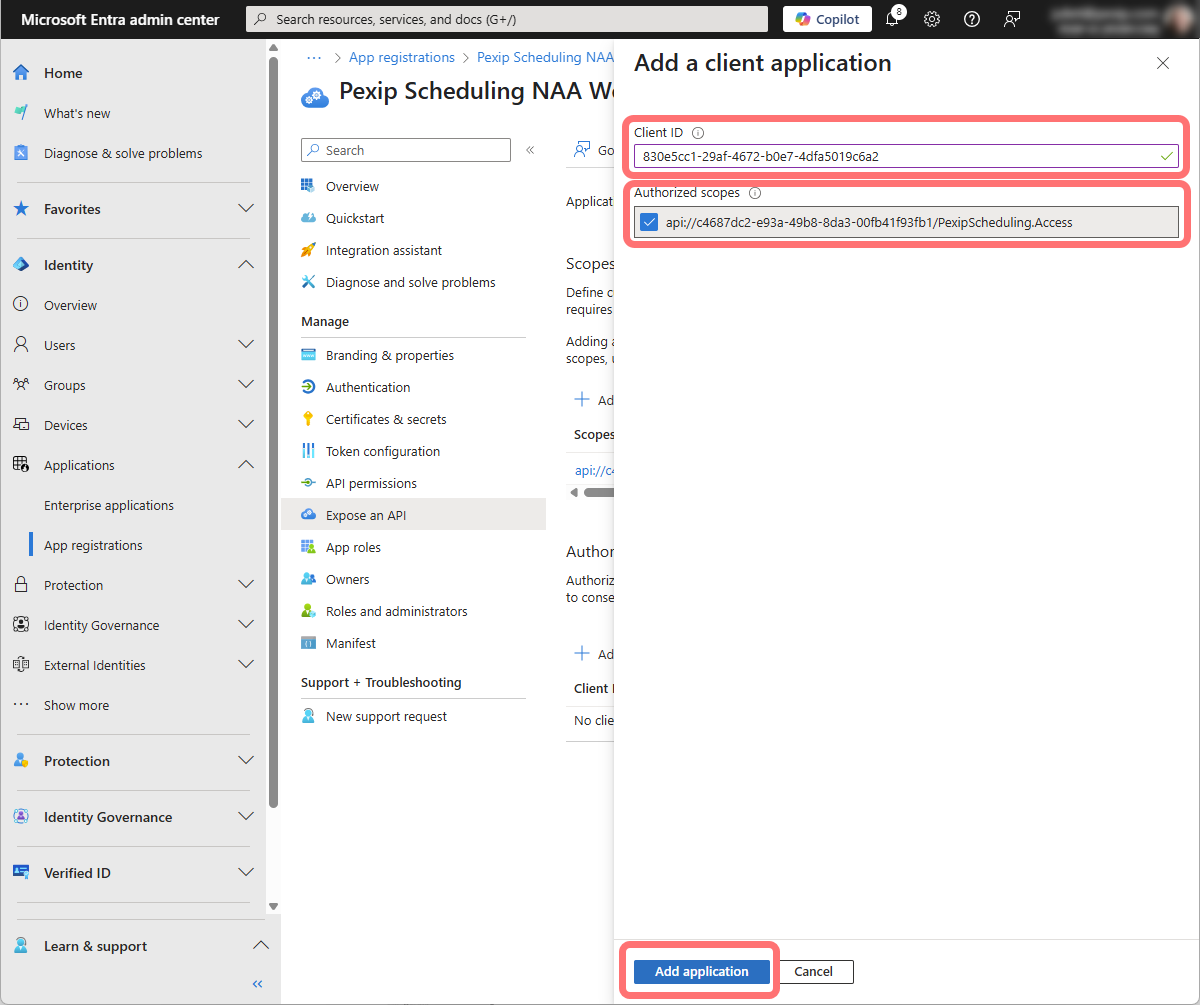 This process involves creating an application in Microsoft Entra with two separate registrations — a Web API registration and an App registration. We recommend that you also pre-authorize the App to access the Web API, to avoid users having to grant consents the first time they use the add-in. When you have completed this process, you must configure Pexip Infinity with details of the app registration.
