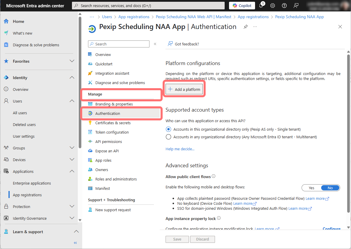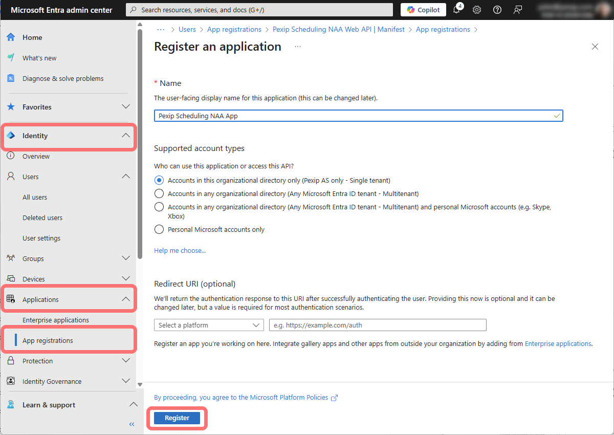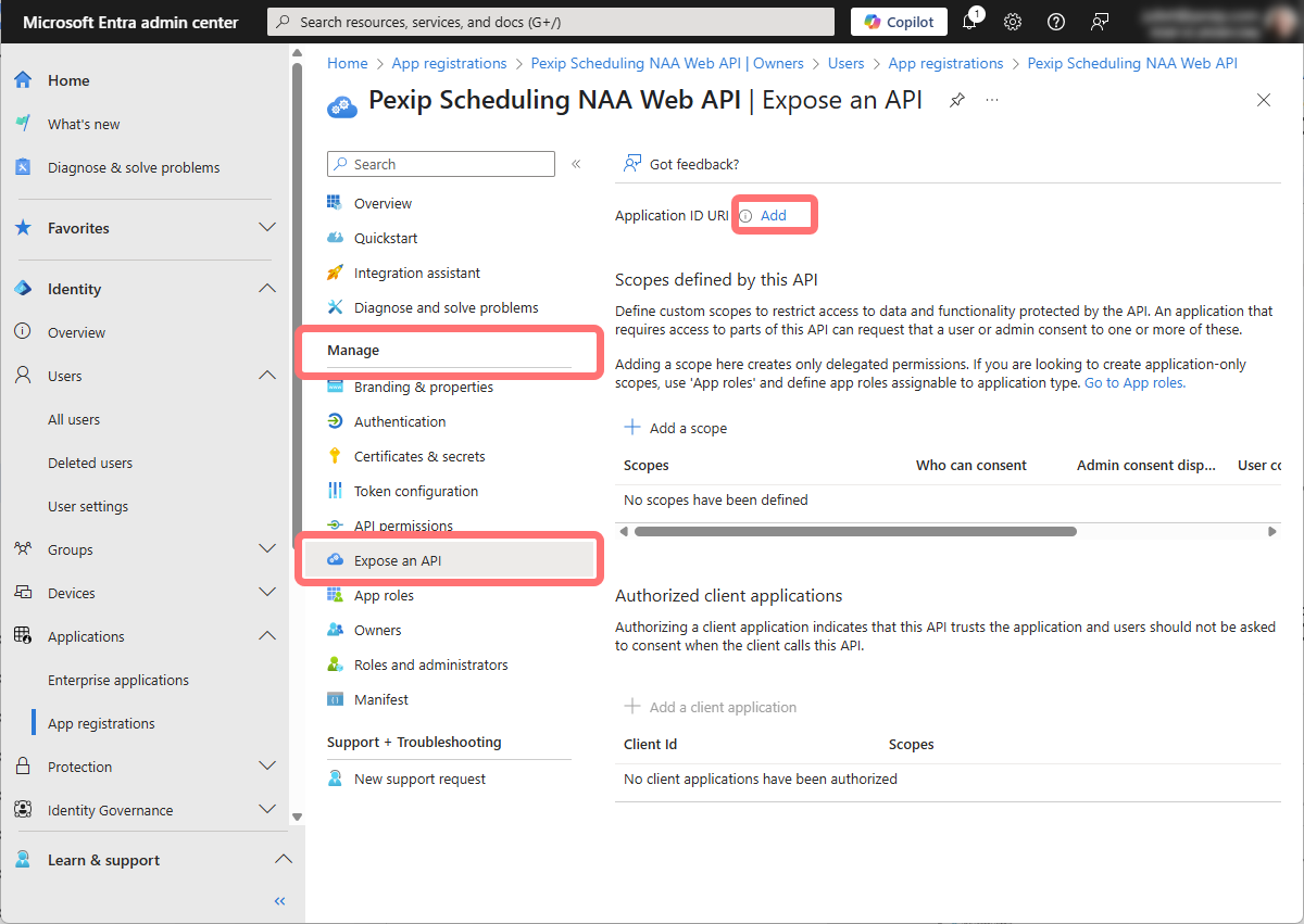 This process involves creating an application in Microsoft Entra with two separate registrations — a Web API registration and an App registration. We recommend that you also pre-authorize the App to access the Web API, to avoid users having to grant consents the first time they use the add-in. When you have completed this process, you must configure Pexip Infinity with details of the app registration.