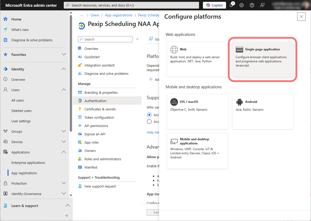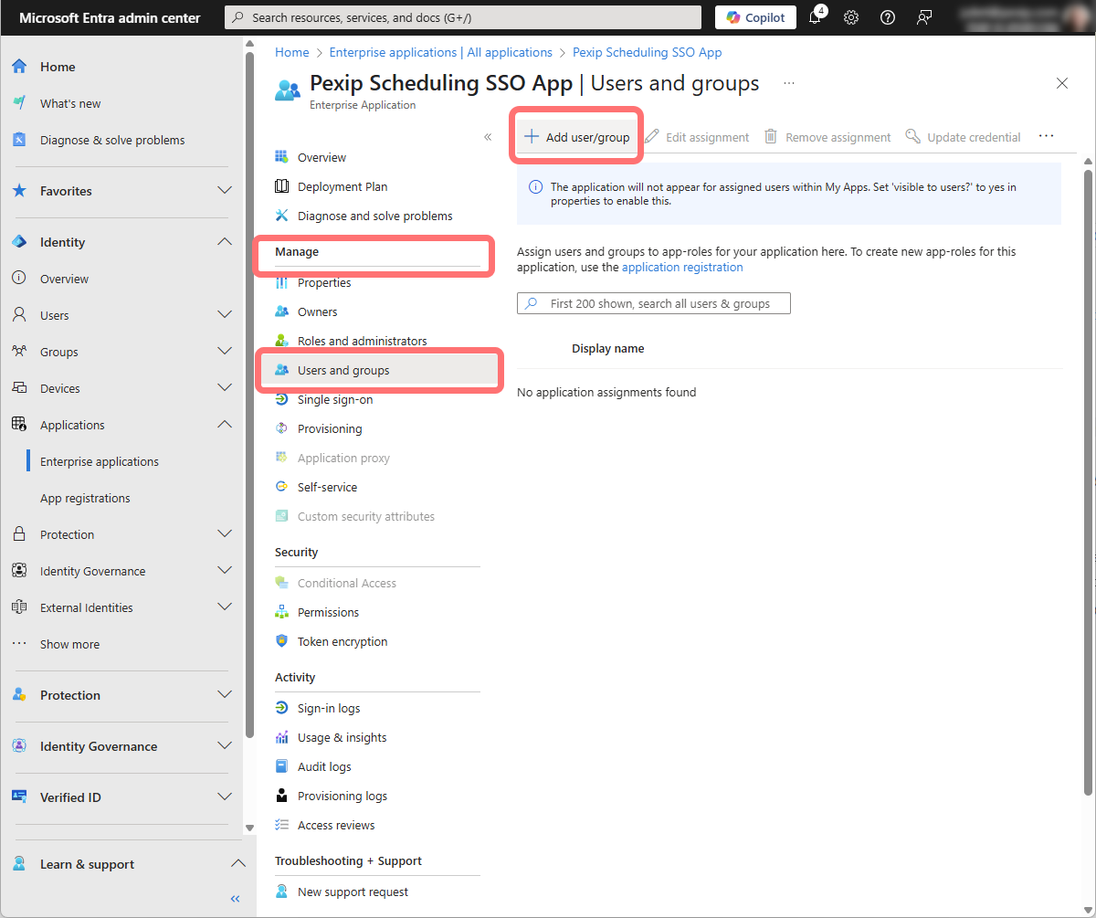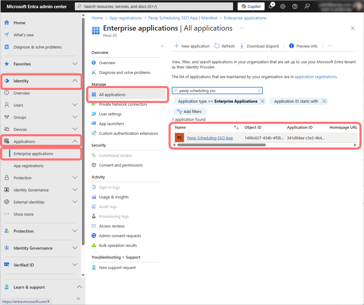From the left hand panel, select and select the application you have just created (in our example this was called Pexip Scheduling SSO App):