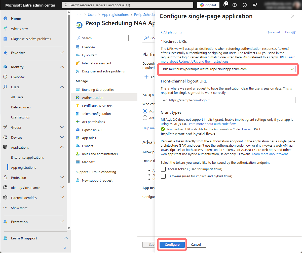 In the Redirect URIs field, enter a URI in the form: brk-multihub://<add-in server FQDN>, for example brk-multihub://pexample.westeurope.cloudapp.azure.com