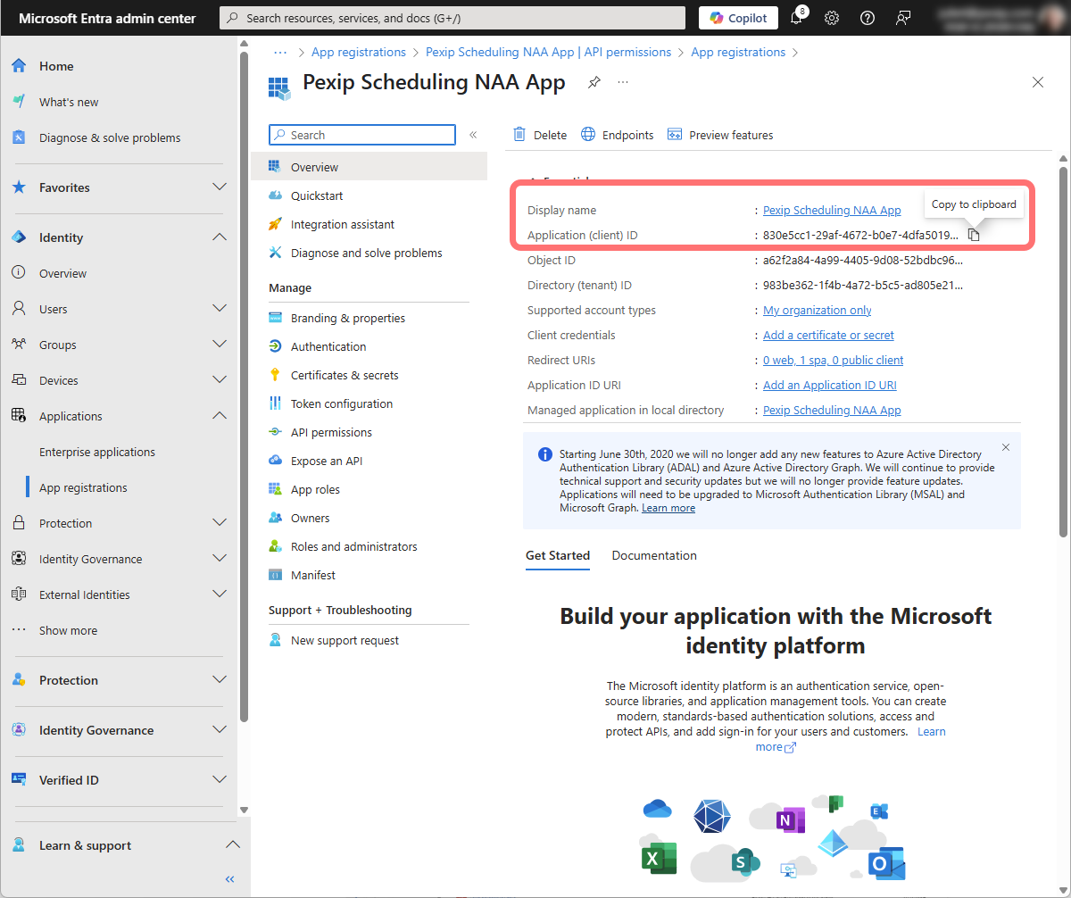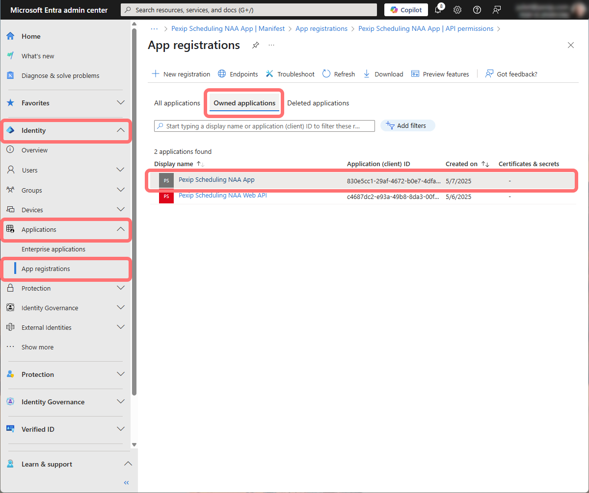 From the App registrations page, select the Owned applications tab. From the list of Apps, find the NAA App you created earlier. (In our example, this was named Pexip Scheduling NAA App):
