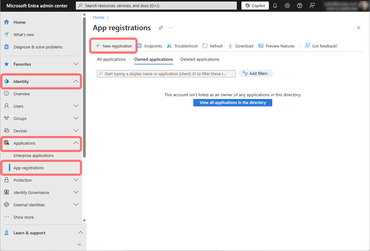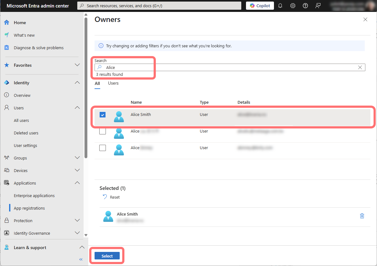 Adding an owner is optional. We recommend adding yourself as an owner because it makes it easier to find the app registration in later steps. You can add additional users as owners at any point.