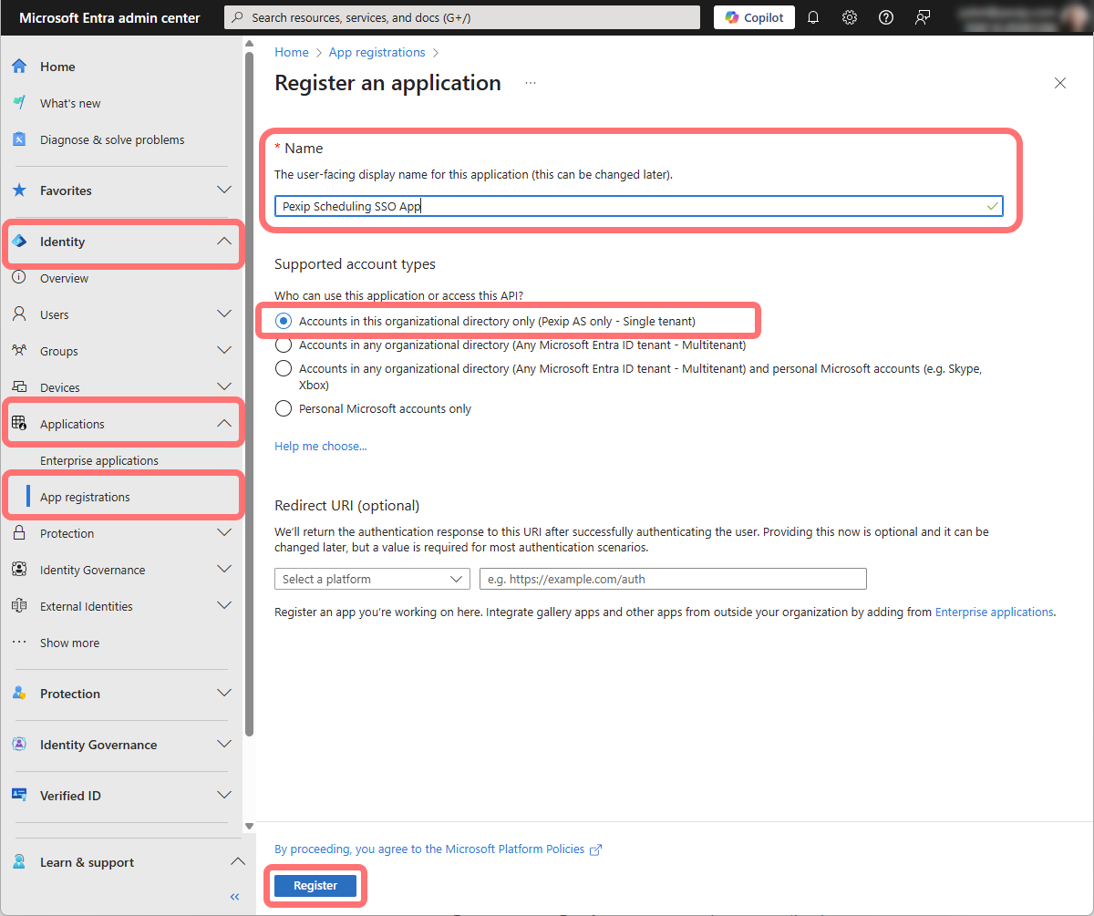 - Name: in our example we have used Pexip Scheduling SSO App.