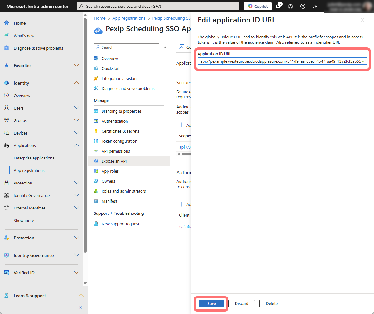 For example, if the value that was generated was api://ffe83558-b6bd-45eb-b3ac-7c34b08be297, you should change this to e.g. api://pexample.westeurope.cloudapp.azure.com/ffe83558-b6bd-45eb-b3ac-7c34b08be297.