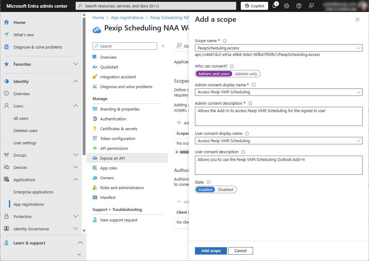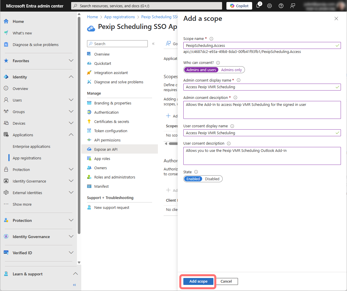 Scope name: enter PexipScheduling.Access — you must use this value, do not modify it.