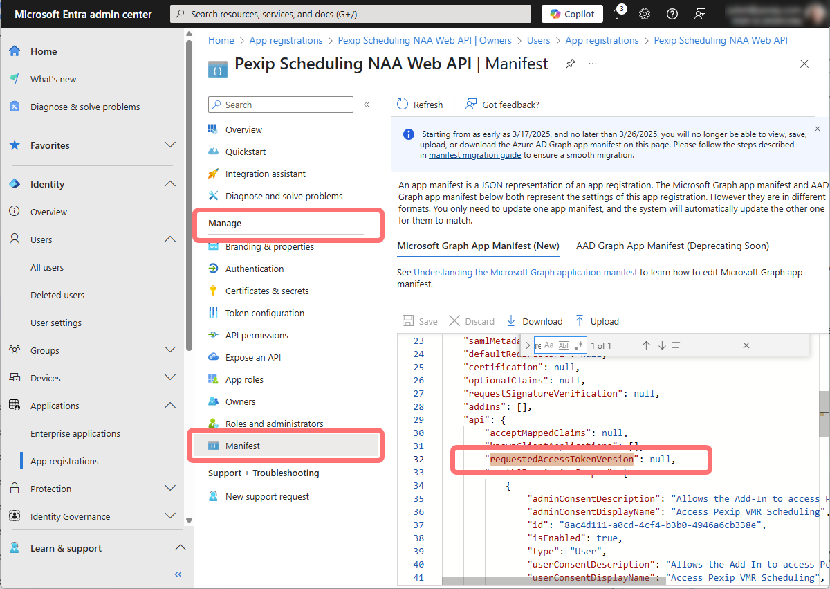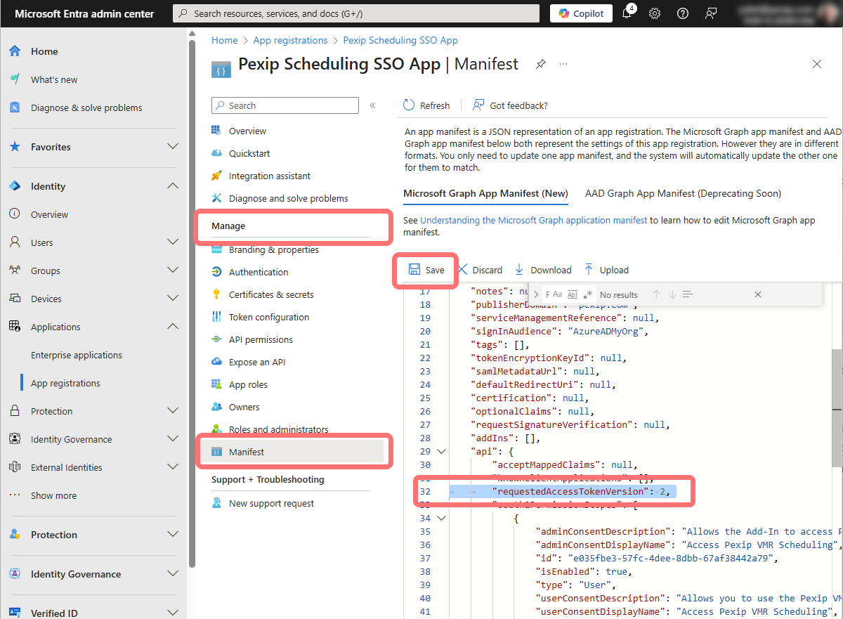 requestedAccessTokenVersion(you can use your web browser's search function to locate it).By default, it is set to a value of