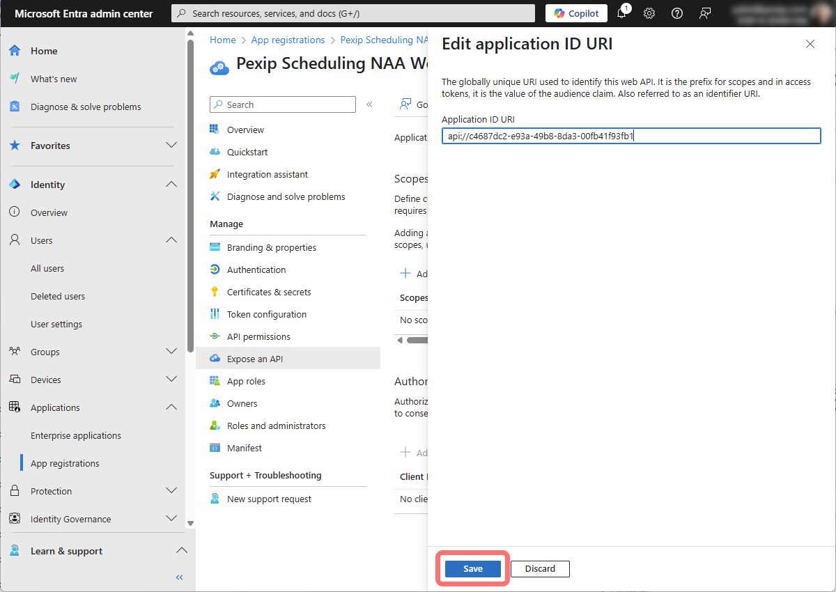 An with a unique app UUID is generated automatically. Change the URI so that it is in the format api://<add-in server FQDN>/<app-id>, where