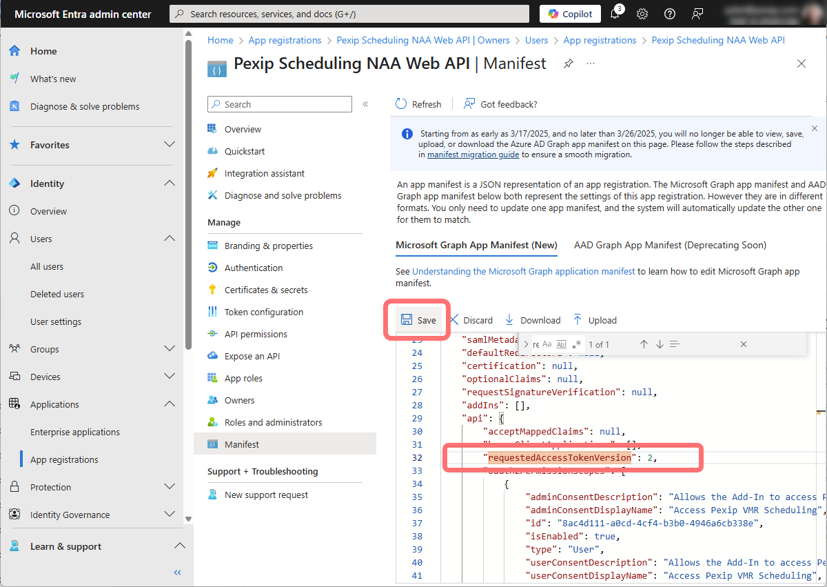 nullwith the value2, so it looks like this:"requestedAccessTokenVersion": 2,Select :