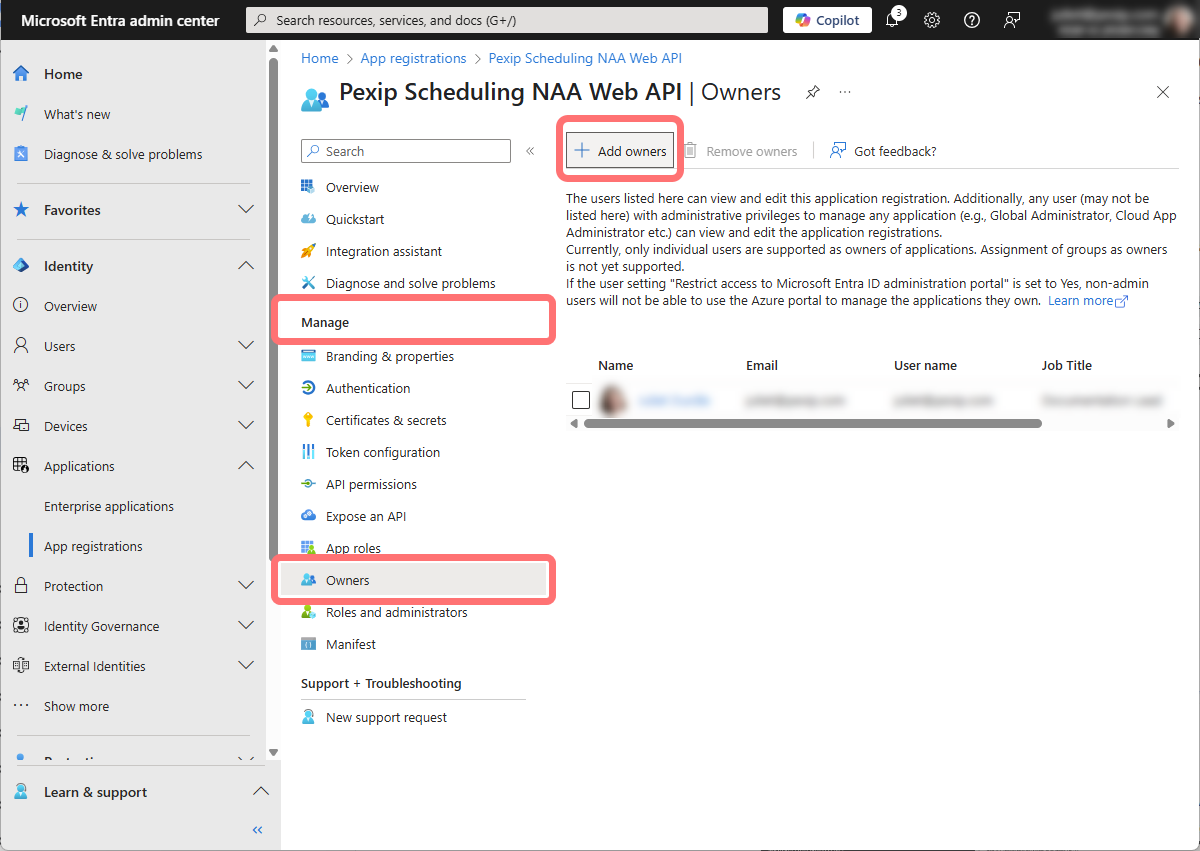 Go back to the list of Owned applications and find the NAA Web API you created earlier.