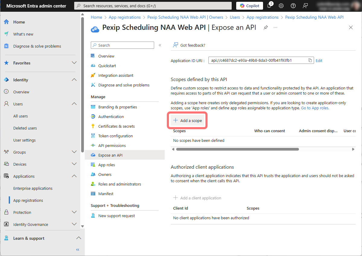 Authorized scopes: only one scope should be listed; this should end in PexipScheduling.Access; tick the checkbox next to this scope.