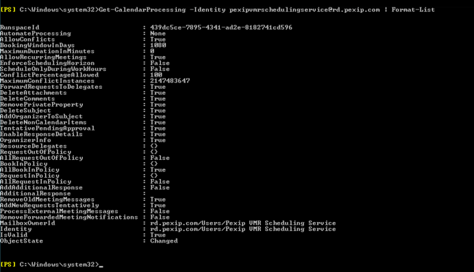 This command creates an equipment resource with the specified Name, Alias and Display Name. Name and Display Name should be the same, and will appear as the location of any meeting requests, and as a recipient. The Alias (also known as the mail nickname) is used as the email address. New-Mailbox -Equipment -Name "<Equipment Name>" -Alias "<Equipment Alias>" -DisplayName "<Equipment Name>" For example: New-Mailbox -Equipment -Name "Pexip Scheduling Service" -Alias pexip.scheduling -DisplayName "Pexip Scheduling Service" |