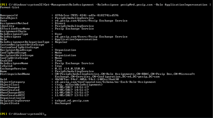 New-ManagementRoleAssignment -name:PexipSchedulingService -Role:ApplicationImpersonation -User:pexip@exchange.example.com