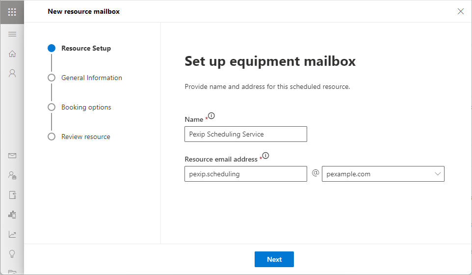 In this step you create an equipment resource used by Secure Scheduler for Exchange. This resource is added as an attendee to all meetings scheduled using the Pexip add-in. The scheduling service monitors the equipment resource's mailbox, processes all meeting requests sent to it, and schedules the meetings as appropriate.
