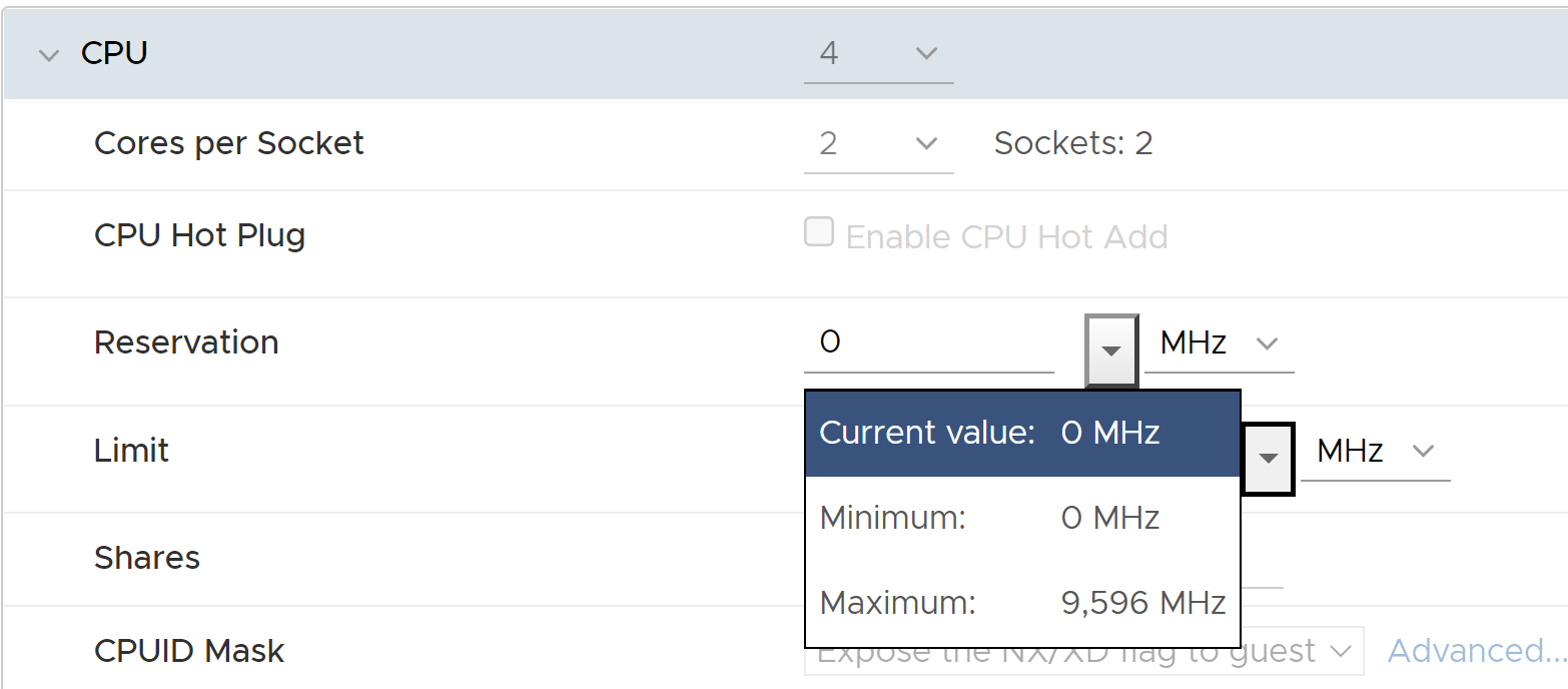 There are three CPU resource settings: Reservation, Limit, and Shares. These specify the guaranteed CPU resource for the VM, the maximum CPU resource for the VM, and the weighting applied to the VM when sharing resources with its siblings.