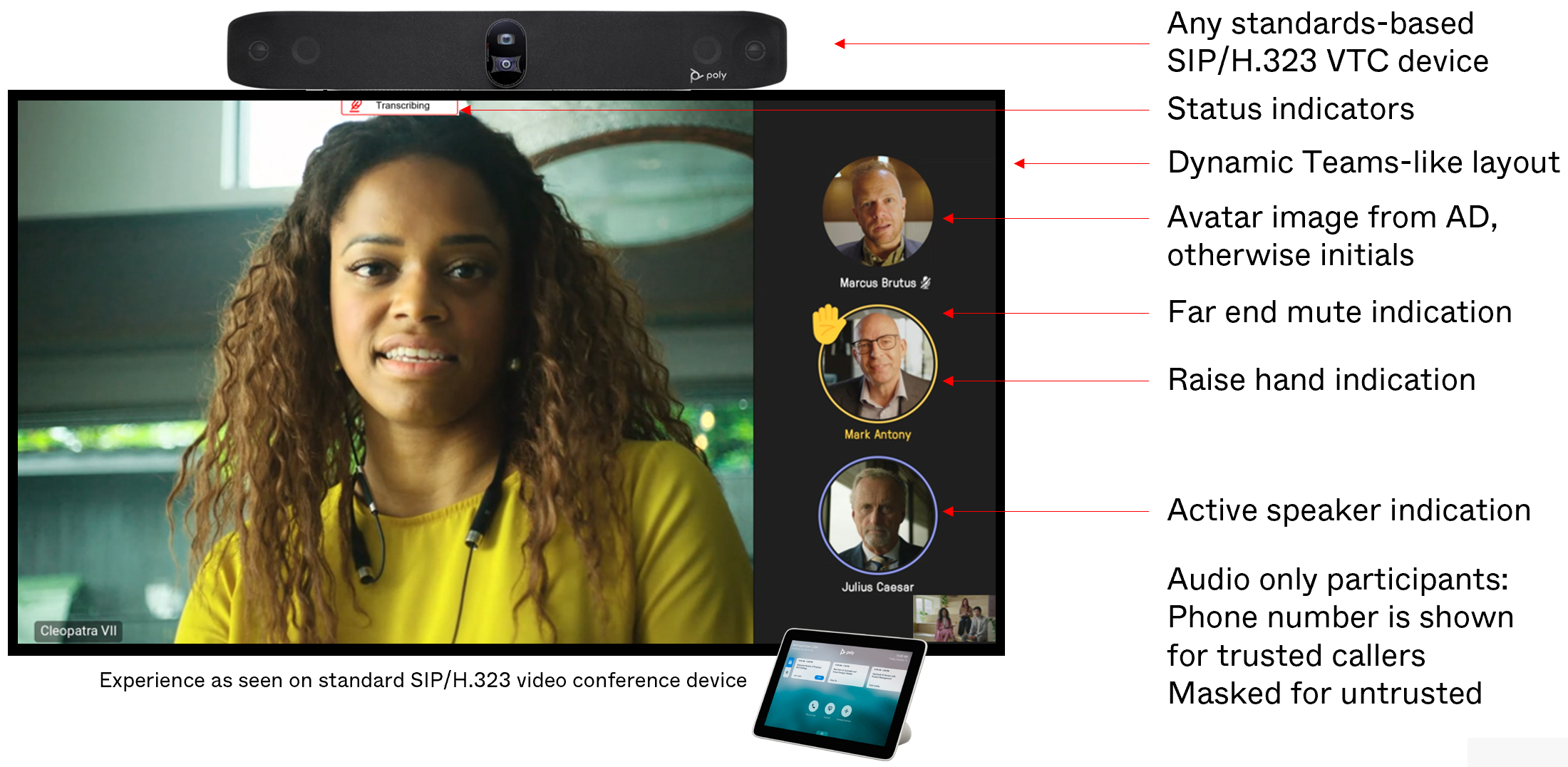 • Lobby bypass for trusted endpoints, notifications and customizable waiting screen for untrusted VTC endpoints that are held in the lobby