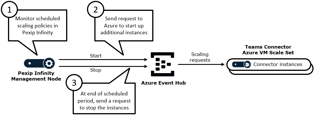 You set up your scheduled scaling policies with Pexip Infinity. These are then monitored within Pexip Infinity and it sends instructions to Azure via the Azure Event Hub to start up or shut down the requested instances at the appropriate times as defined by the policy.