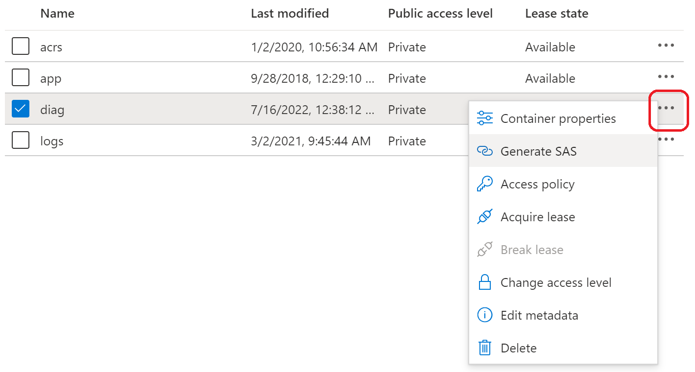 As of version 30, logs are stored in a diag container (previously logs container), and access is now via user delegated SAS tokens (previously SAS tokens signed by the account keys).