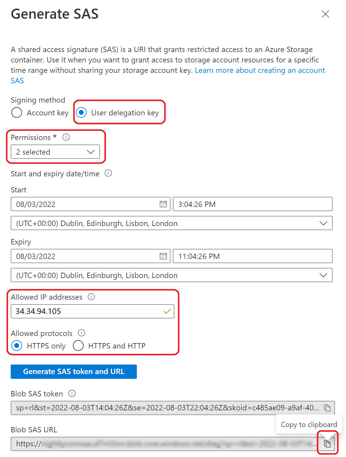 - Copy the Blob SAS URL that appears. You will use this in the Pexip upload portal.