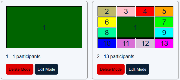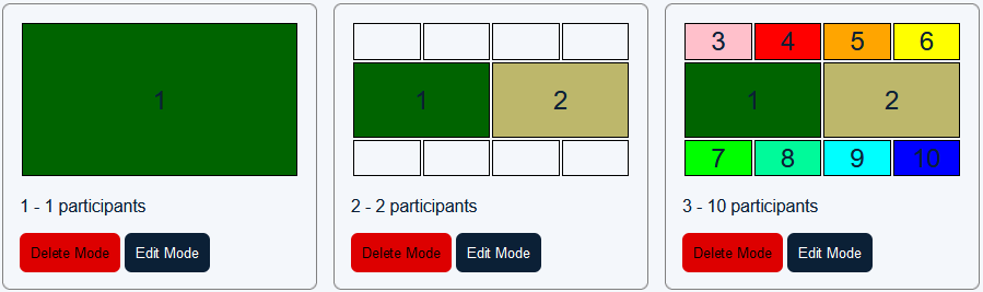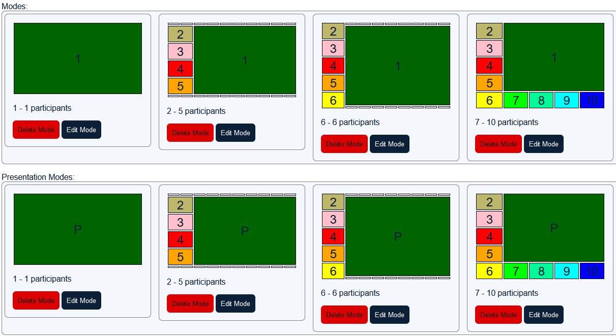 - 4 basic modes: the first mode is for when there is 1 participant to display, the second mode is for 2-5 participants, the third mode is for 6 participants, and the fourth mode is for 7-10 participants.