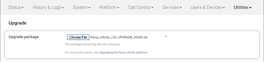 4. From the Pexip Infinity Administrator interface, go to Utilities > Upgrade.
