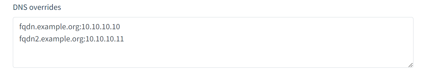 This allows you to either override specific DNS names or add additional DNS to IP pointers for scenarios where you don’t have a valid DNS A record. These overrides are applied in the ERM application and its containers and not on OS level. Specify each override on a separate line, for example: