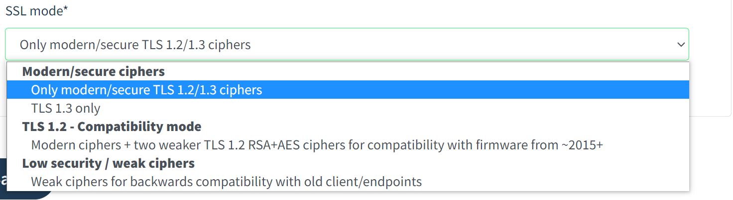 The default SSL Mode and Cipher suite is Only modern/secure TLS 1.2/1.3 Ciphers.