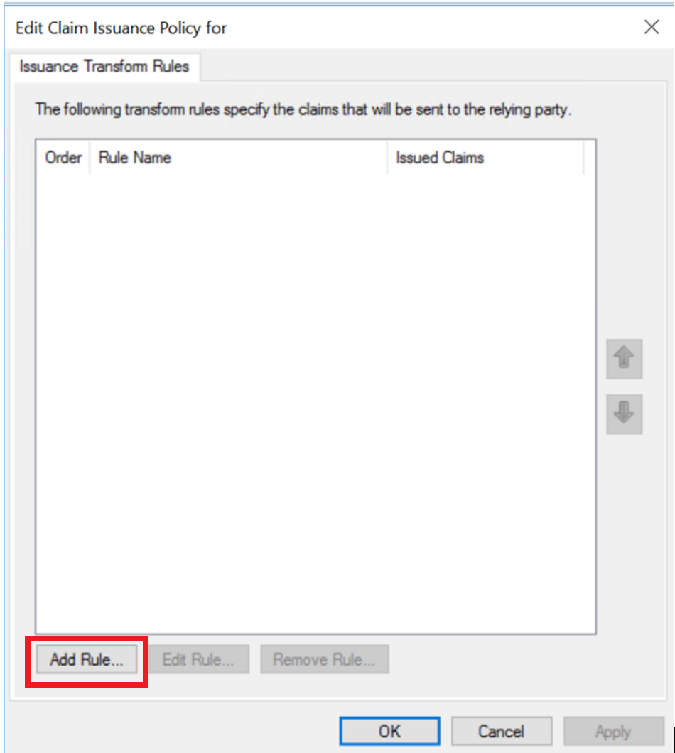 A claims configuration window opens where you can define issuance transform rules. Select .