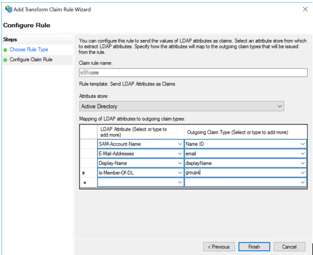 Enter a name for your own reference. From the Attribute store option, select Active Directory. From the lists that then appear, map the following attributes to claim types: