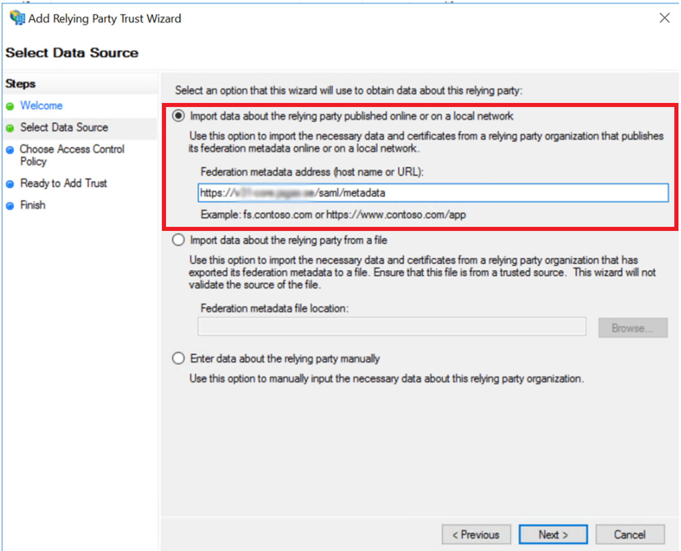 Select Import data about the relying party published online or on a local network and enter the following URL in the field: