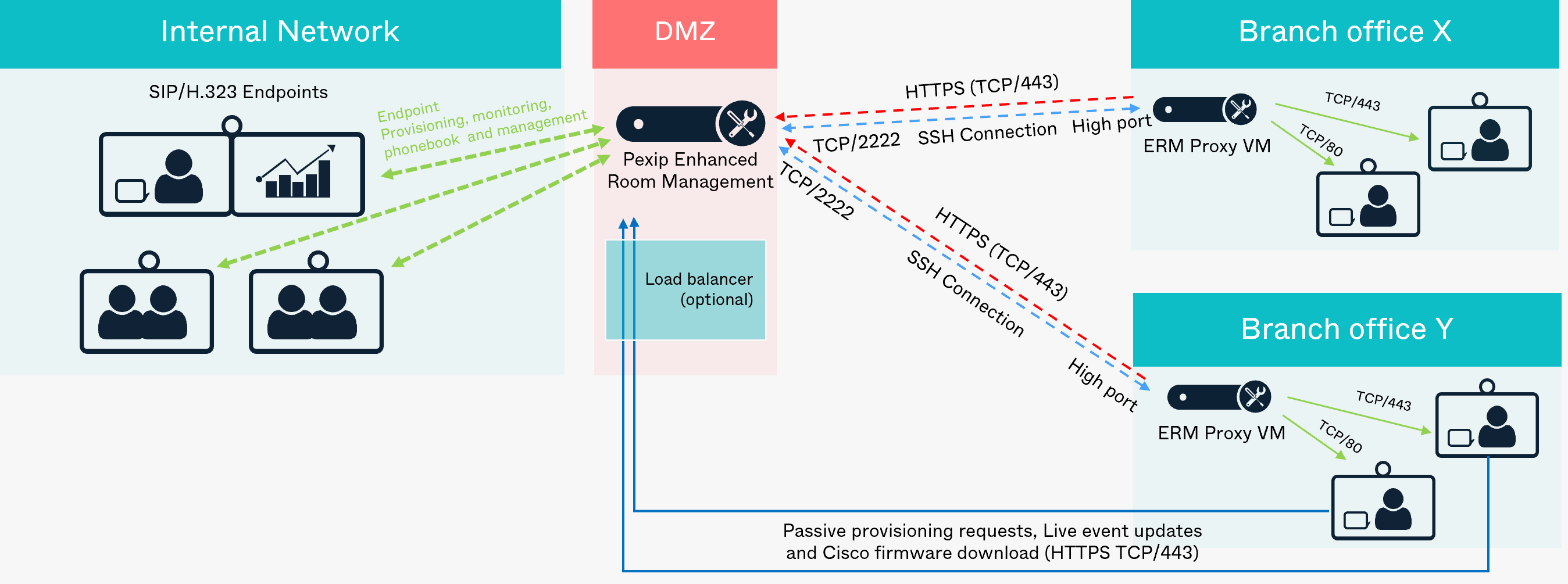 Endpoints are configured for passive provisioning and live event updates. These HTTP requests are sent directly from the endpoints to the ERM service. Configuration of passive provisioning enables a fallback connection to the ERM service.