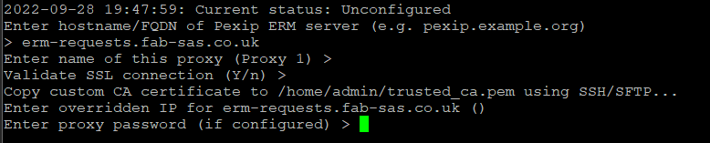 After the network and security steps of the installation wizard are complete, the main ERM Proxy configuration menu is displayed. Here, you can configure the main operation of the ERM Proxy to connect to an upstream ERM service: