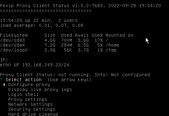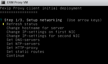 No changes should be made to any ERM Proxy via the terminal interface (other than as described when running the initial installation wizard) unless directed to do so by Pexip support. This includes (but is not limited to) changes to the time zone, changes to IP tables, the configuration of Ethernet interfaces, or the installation of any third-party code/applications.