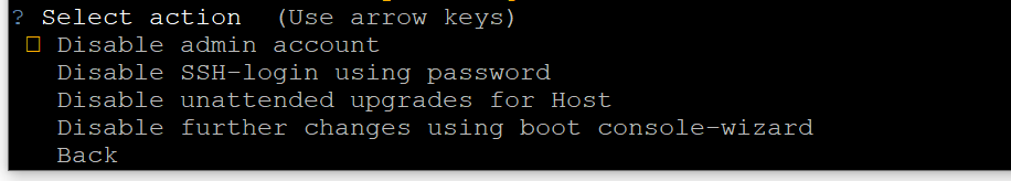 When you have chosen your options in this section, select at the bottom of the list to proceed. As long as you have not selected Disable further changes using boot console-wizard, you can always return to these security choices later on to make additional changes.