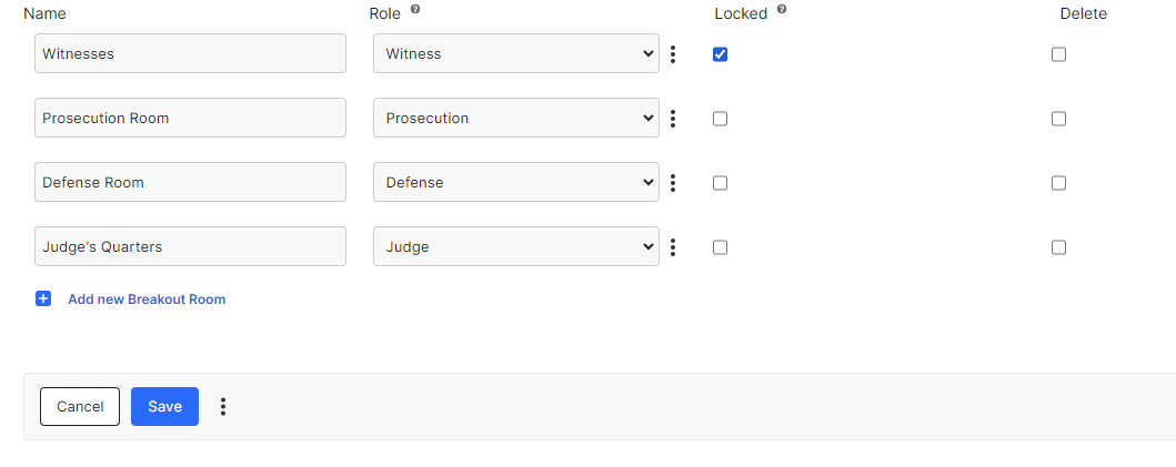 When you create a breakout room, you must give it a Name and assign a Role to the room. Participants with this role will enter this breakout room when they join the hearing. The example below shows four breakout rooms, one for witnesses, prosecution, defense, and judge.