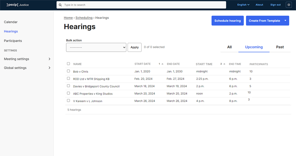To schedule a new hearing, log in to the Pexip Justice portal and go to Hearings.