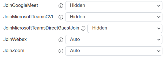 If you have a Webex-connected endpoint with existing Google and/or Teams join buttons, for Direct Guest Join or similar, they can be disabled on the Cisco web interface to avoid confusion for the end users. Go to Settings > User Interface and set JoinGoogleMeet, JoinMicrosoftTeamsCVI and JoinMicrosoftTeamsDirectGuestJoin to Hidden. Zoom and WebEx join buttons can remain enabled if desired, as they will place regular Webex or SIP calls.
