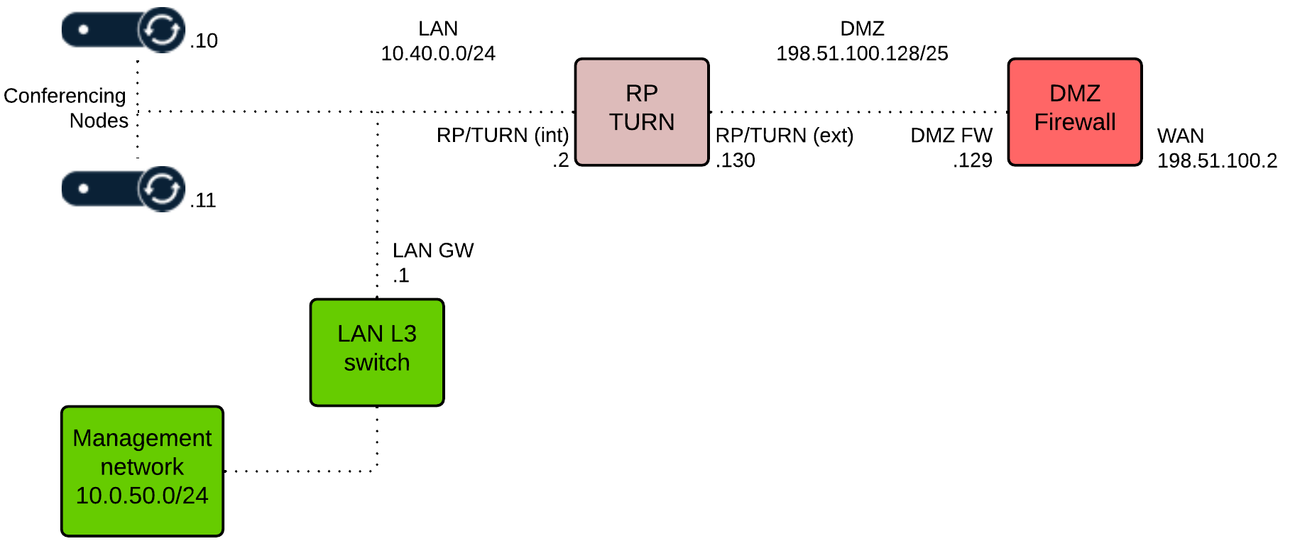 There is no NAT between the outside and the DMZ network segment. The reverse proxy/TURN server uses the DMZ firewall 198.51.100.129 as its default gateway, and is also configured with a static route to the 10.0.50.0/24 management network via the LAN gateway at 10.40.0.1 so that SSH management traffic from this management network can function.