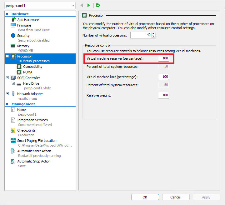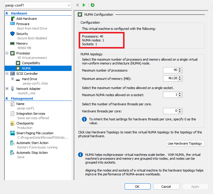 1. From within Hyper-V, select the Conferencing Node VM, and then select Settings > Hardware > Processor > NUMA.