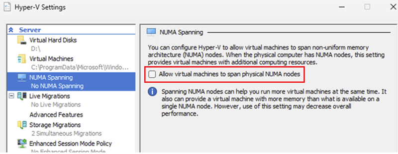 For information about NUMA spanning and how to check your VM's configuration, see the following Microsoft articles: