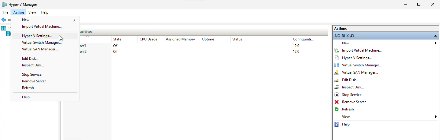1. From within Hyper-V Manager, right-click on the server and select Hyper-V Settings...: