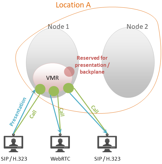 Pexip Infinity requires 3.25 HD resources on Node 1 (2.25 for the connected participants, and 1 for the backplane), and 2 HD resources on Node 2, (1 for the connected participant, and 1 for the backplane).